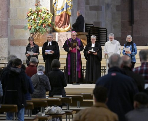 Speyer. Deutschlandweit fanden am Montag ökumenische Friedensgebete statt, um an den Jahrestag des terroristischen Überfalls der Hamas auf Israel und den daraus resultierenden Krieg zu erinnern, und um für ein Ende des Krieges und der Gewalt zu beten. In Speyer hatten Bischof Dr. Karl-Heinz Wiesemann (Bistum Speyer) und Kirchenpräsidentin Dorothee Wüst (Evangelische Kirche der Pfalz) gemeinsam in den Dom geladen. Zusammen mit Pfarrer Eicher, Gemeindereferent Bernhard Werner und Ehrenamtlichen feierten sie einen Wortgottesdienst. Das Ökumenische Friedensgebet setzte ein Zeichen der Solidarität mit allen Menschen, die leiden und auf Frieden und Versöhnung hoffen.